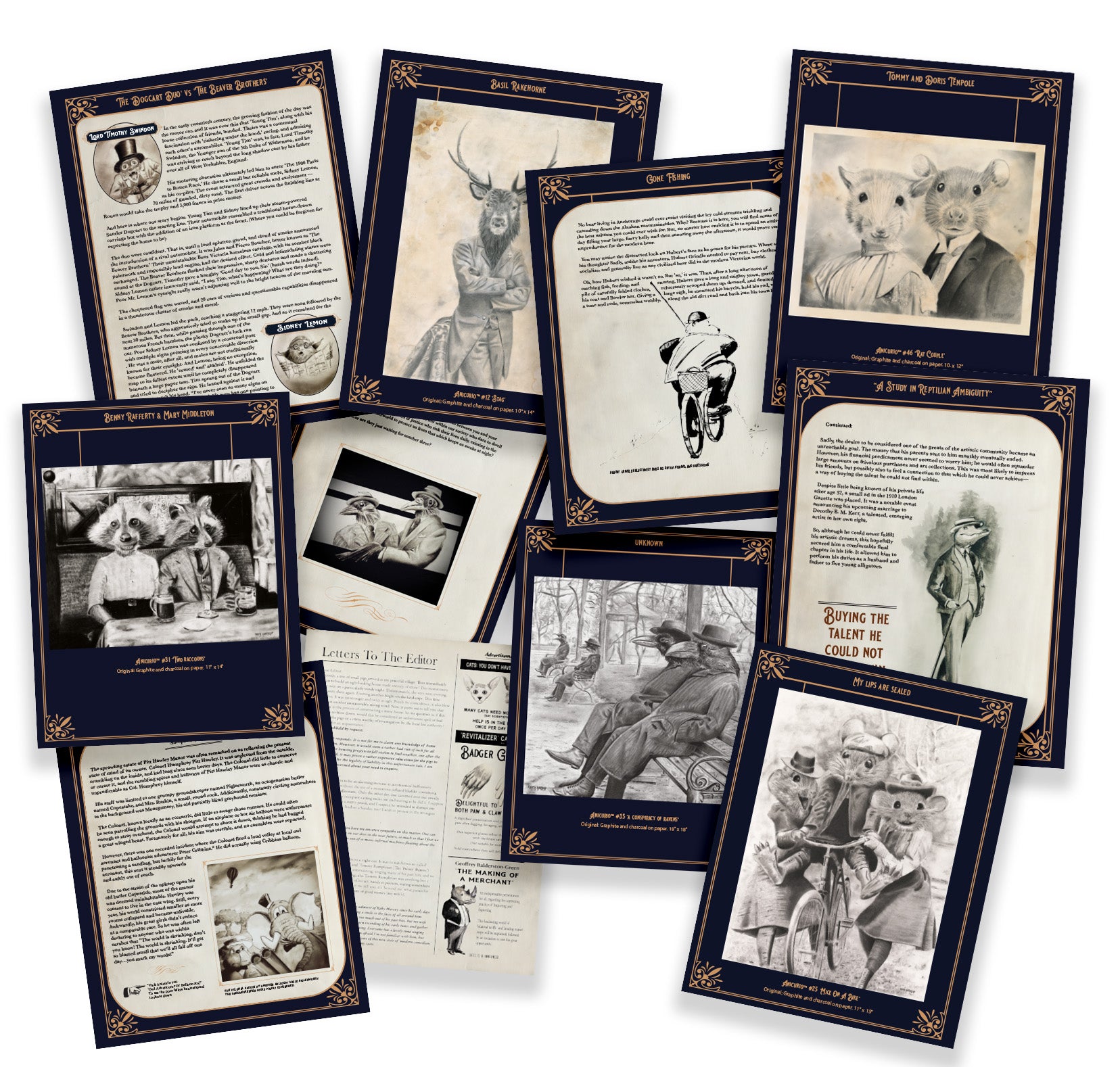 Immerse yourself into a beautiful world of artwork and tales. All of my 'Anicurio Collection' characters together in one book. 50 full-page drawings, supporting illustrations and stories, all wrapped up in a Victorian-style publication, complete with imaginary ads, letters to the Editor, social tips, advice columns, and even the odd recipe.